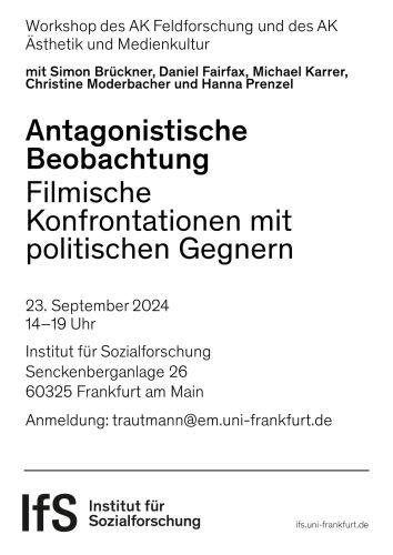 Die Vorbereitungsmaterialien für den Workshop (Texte und Filmausschnitte) werden nach Anmeldung per Mail versendet. Der Workshop ist Teil einer Veranstaltungsreihe der Arbeitskreise »Feldforschung« und »Ästhetik und Medienkultur« des Instituts für Sozialforschung. Die Reihe widmet sich der Epistemologie ästhetischer Verfahren in der Feldforschung und gesellschaftskritischen Aspekten künstlerischer Untersuchungsverfahren.