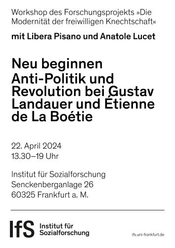 Dass der Erfolg von Emanzipationsbemühungen nicht schon in der Übernahme der Macht besteht und dass sich Herrschaftsverhältnisse nicht einfach mit Gegengewalt zerschlagen lassen, diese Überzeugung zeichnet eine Linie der Herrschaftskritik aus, die sich von der Neuzeit bis in den sozialistischen Anarchismus, genauer von Étienne de La Boétie bis Gustav Landauer ziehen lässt. Für beide ist klar, dass der revolutionäre Prozess ein Subjekt schafft, das sich aus sich selbst heraus aber auch gegen seine eigene Involvierung in Herrschaft befreien muss. Hierin teilen sie einen utopischen sowie zugleich skeptischen Sinn für die Revolution. Für Landauer wird die Einbeziehung der neuzeitlichen Herrschaftskritik zu einer wichtigen Quelle für die Reflexion der revolutionären Bestrebungen seiner Zeit, wie dessen zentrales Werk Die Revolution (1907) zeigt. Die Transformation der Herrschaft im Sinne einer »freiwilligen Knechtschaft« (La Boétie) wird für ihn zur Herausforderung einer jeden Revolution.
