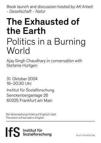 Climate change is not only about the exhaustion of the planet, it’s about the exhaustion of so many of us, our lives, our worlds, even our minds. So, what is to be done? To answer this question, Ajay Singh Chaudhary brings together both the science and the politics of climate change. He shows how a new politics particular to the climate catastrophe demands a bitter struggle between those attached to the power, wealth, and security of “business-as-usual” and all of us, those exhausted, in every sense of the word, by the status quo. With Stefanie Hürtgen we will discuss these extractive circuits, as Ajay calls them: The permanent increase and capitalist appropriation of both, ecological and social energy. We will critically elaborate on labor and what is widely known in our times as “the” economy. Is the political subjectivity of exhaustion that Ajay outlines a starting point for the necessary fundamental changes?